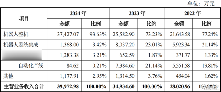 2022年、2023年和2024年(简称“报告期”),节卡机器人的主营业务中,机器人整机的营收占比均为73%以上,2024年增至93.63%;机器人系统集成等其他项目占比较低。